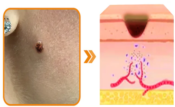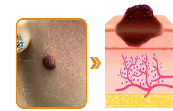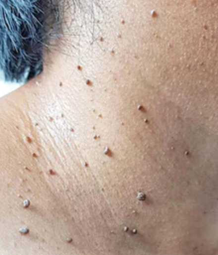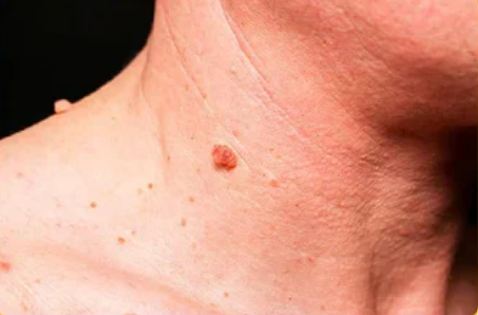 Raised skin tag, uneven tone, and visible blemishes.